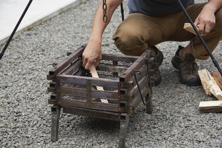 テラスでは焚き火の準備をスタート。焚き火台はレンタル可能、薪(別売)も豊富で焚き火のしがいがあります(トライポッドは持ち込みました)。