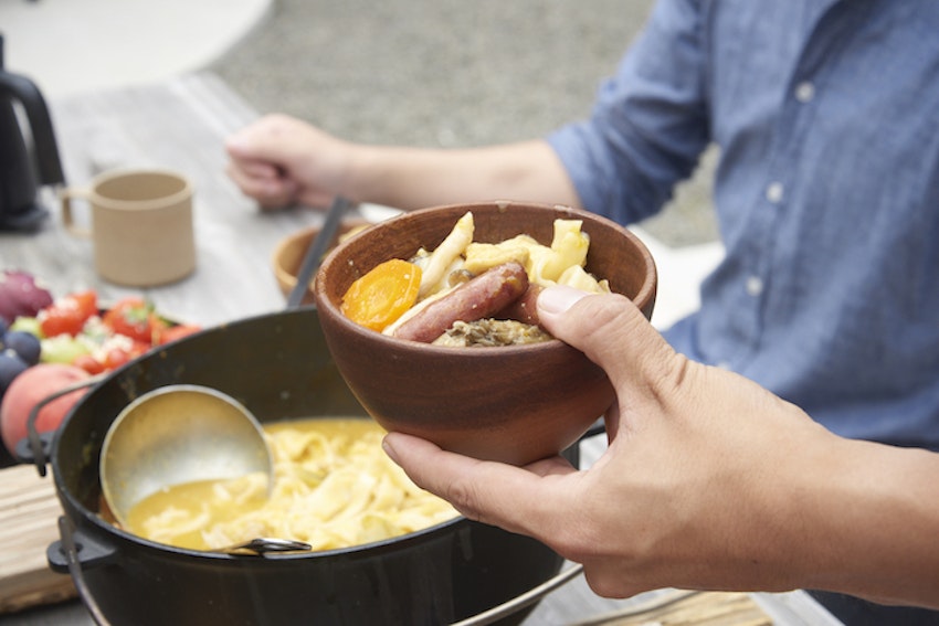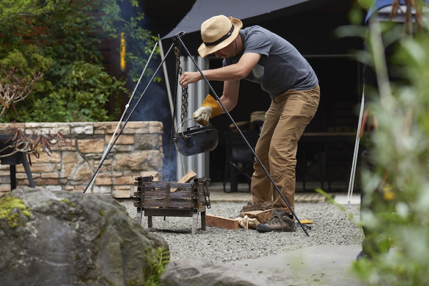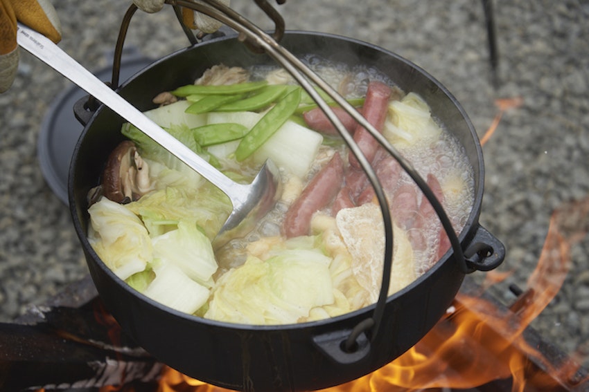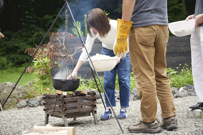 持ち込んだダッチオーブンで、お湯を沸かしておきます。設備が充実しているとはいえ、こうして適度に愛用ギアを使えるところが男性キャンパーにも人気の所以。