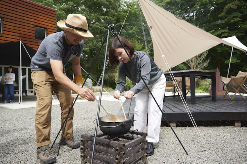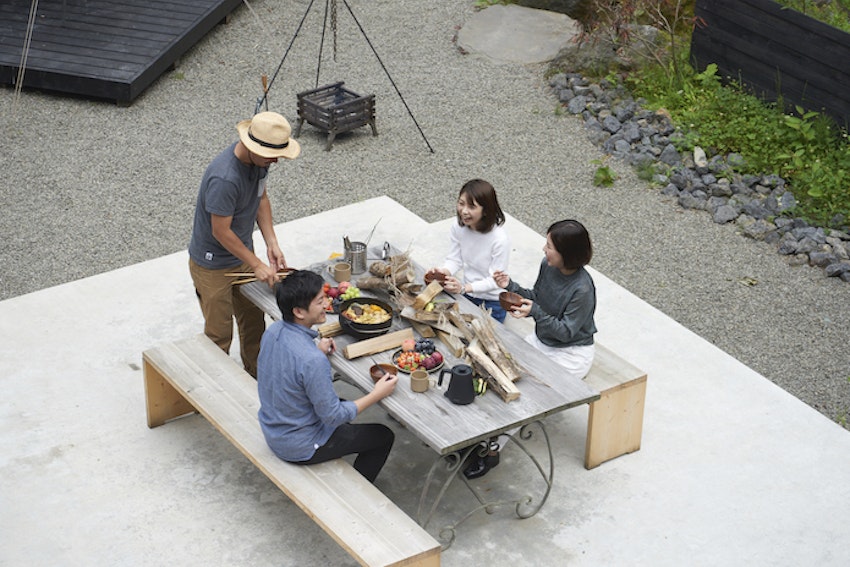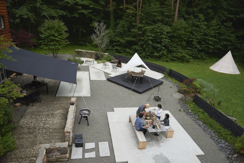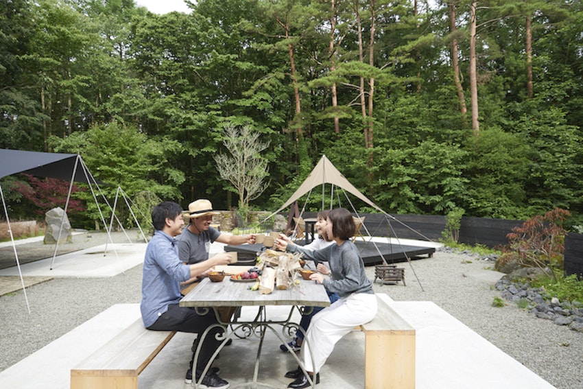 テラスや庭で食事をしたり焚き火をしたり、アウトドア体験も楽しめる「yl&Co.Hotel in Mt.Fuji」。