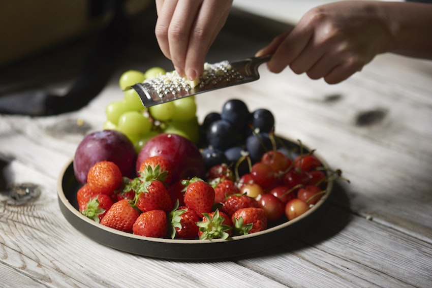 ジーノの作り方はいたってシンプル。フルーツの上にホワイトチョコを削るだけです!