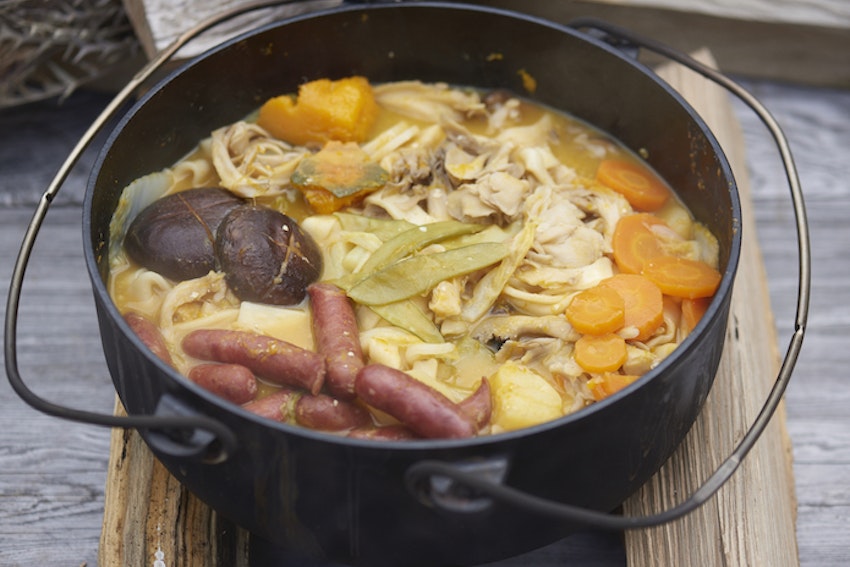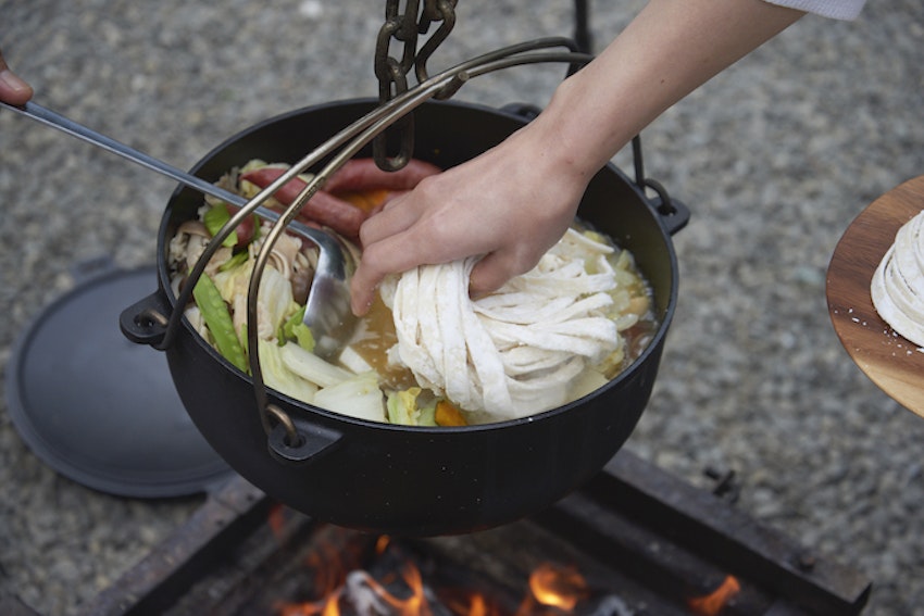 なんとかスペースを作って、ほうとうを入れていきます。このまま5分煮込みます。焚き火が弱火になっていないかチェックも忘れずに。