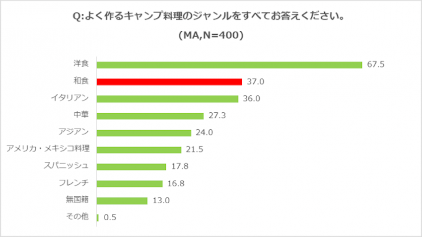 『よく作るキャンプ料理のジャンルをすべてお答えください。』という質問では1位「洋食」、2位「和食」、3位「イタリアン」という結果に。キャンプといえばバーベキューなどの肉料理や「カレーライス」や「ハンバーグ」などのダッチオーブンやスキレットとの相性の良い洋風の料理をイメージしがちですが、意外にも2位は「和食」でした。