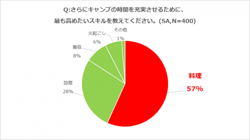 全回答者を対象に『さらにキャンプの時間を充実させるために最も高めたいスキルを教えてください。』という質問を行ったところ、半数以上となる約57%のキャンパーが「料理」と回答。