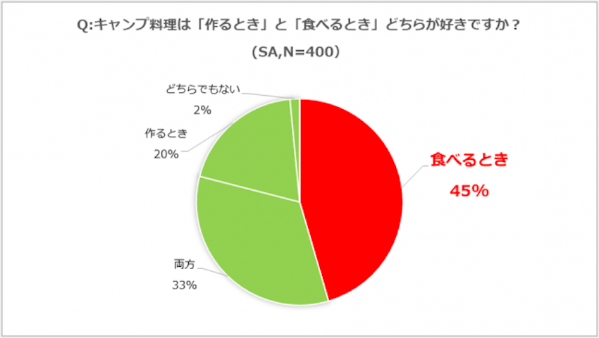 また、『キャンプ料理は「作るとき」と「食べるとき」どちらが好きですか?』という質問に対して約45%が「食べるとき」と回答しており、食べることそのものをより楽しみたいという傾向が明らかに。キャンプにおける“料理・食事”を充実させることが、キャンプの時間をより豊かにする重要な要素なようです(知ってる)。