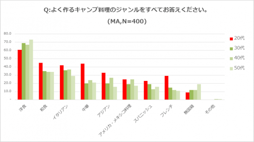 さらに、よく作るキャンプ料理に関する質問において、20代の回答に特徴的な傾向がみられました。よく作るキャンプ料理として「和食」と回答した割合が最も多かったのは20代。また、20代では「中華」「フレンチ」「アジアン」「フレンチ」ジャンルの料理をよく作ると回答する割合がほかの世代に比べて特に高くなっており、若年キャンパーでは“キャンプ飯の多国籍化”現象が生じていることが明らかに。
