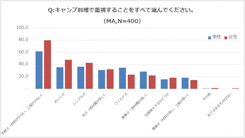 また、同様の質問を男女別で比較すると、女性のほうが“ジタンプ飯”をキャンプ飯に求める傾向が顕著にでており、「手軽さ(材料が少ない、工程が少ない)」「おいしさ」「シンプルさ」のすべての要素において男性を上回る結果に。男性は「ワイルドさ」「豪華さ(食材費が高い)」「複雑さ(材料が多い、工程が多い)」をより重視する傾向がいまだ強いようです。