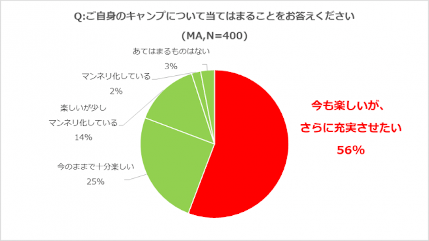 現在のキャンプに関する満足度を測る質問に対しては「今も楽しいがさらに充実させたい」という回答が55.8%で半数を超えています。みなさん貪欲です。