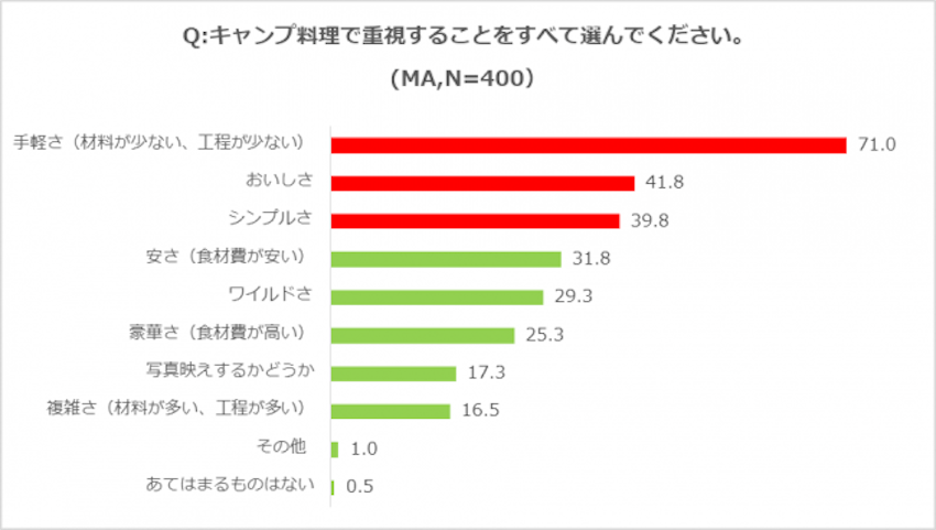 『キャンプ料理で重視することをすべて選んでください。』という質問に対しては、約70%が「手軽さ(材料が少ない、工程が少ない)」と回答。加えて、約42%が「おいしさ」、さらに約40%が「シンプルさ」を重視すると回答。