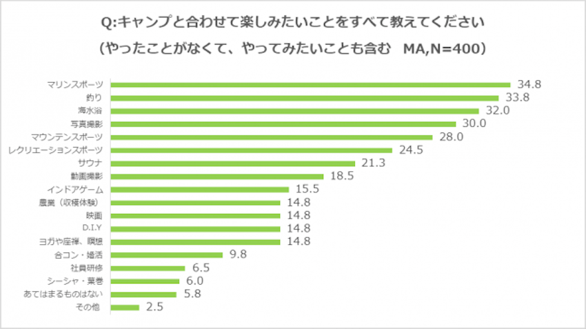 『キャンプと合わせて楽しみたいことをすべて教えてください』という質問に対しては、1位「マリンスポーツ(サーフィン、SUP、カヤックなど)」(34.8%)、2位「釣り」(33.8%)、3位「海水浴」(32%)、4位「写真撮影」(30%)、5位「マウンテンスポーツ(マウンテンバイク、スキー、クライミングなど)」(28%)となっています。SUP人気、まだまだ根強いようですね!