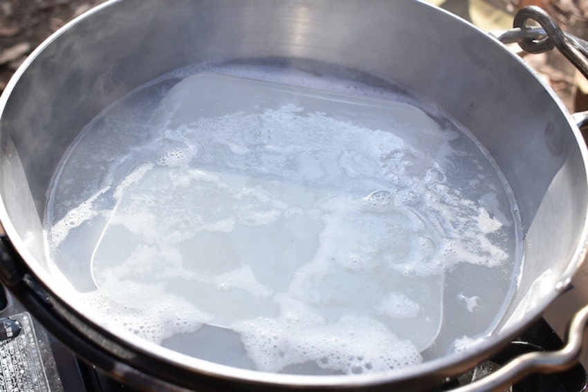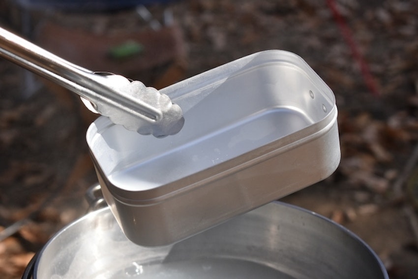 メスティンが入る大きめな鍋にお米の研ぎ汁とメスティンを入れて沸騰させてから、約15分煮る。取手はゴムが劣化するので外して煮込みましょう。