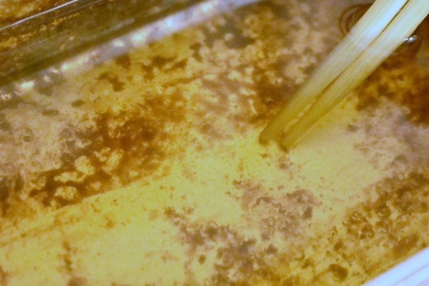 焦げが浸かるくらいの水を入れ、大さじ3杯のお酢を入れて沸騰させ、20分煮込んで火を消して冷めるまで放置。割り箸で焦げを擦る。