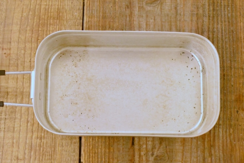 試しに禁じ手とされる重曹で煮込んでみたところ、全体的に白っぽく変色し、表面もざらざらとして感触に。多少アルミが柔らかくなってしまった感覚もあります。やはりメスティンを重曹で洗うのは避けた方がよいでしょう。