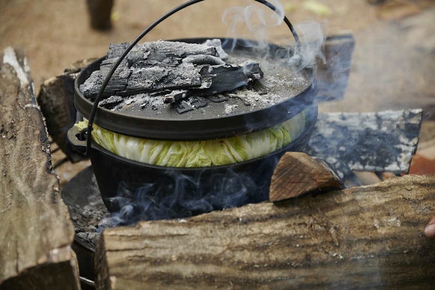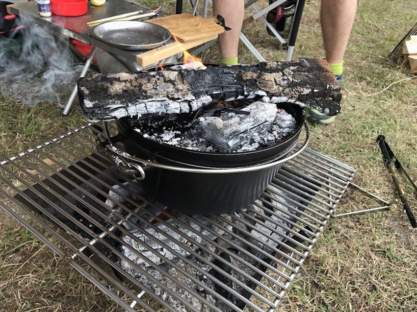 6.ダッチオーブンを下火3:上火7くらいの炭(焚き火)にかけて焼く。