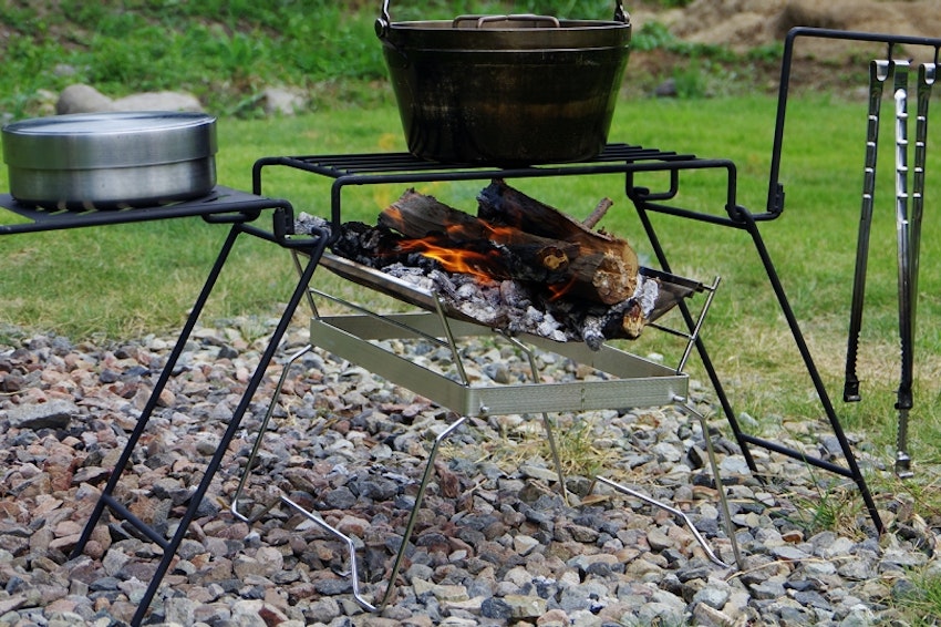 焚き火料理では燃えている薪に直接クッカーを置く方法と、焚き火スタンドを使う方法があります。焚き火スタンドを用意しておくと、クッカーを安定して置けるので、調理途中でひっくり返してしまうなんて失敗をふせげるのでおすすめです。