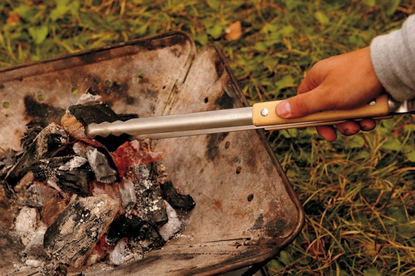 薪や炭を挟んで、焚べるときに使います。燃えている薪を移動させて火加減をコントールできるので、焚き火料理で重宝します。長いほうが火と距離をとれて熱くないので扱いやすいです。