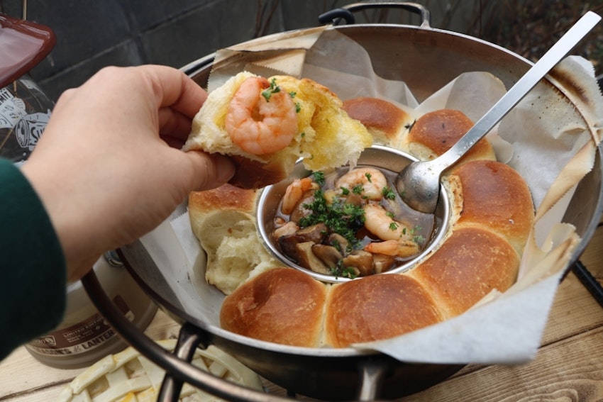 アヒージョを軽く別の鍋で煮込んであとはシェラカップでパンを焼くついでに加熱、保温すると焼きたてのパンに熱々のアヒージョをつけて食べることができます。