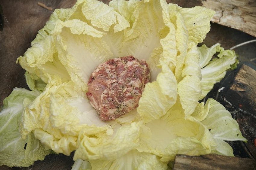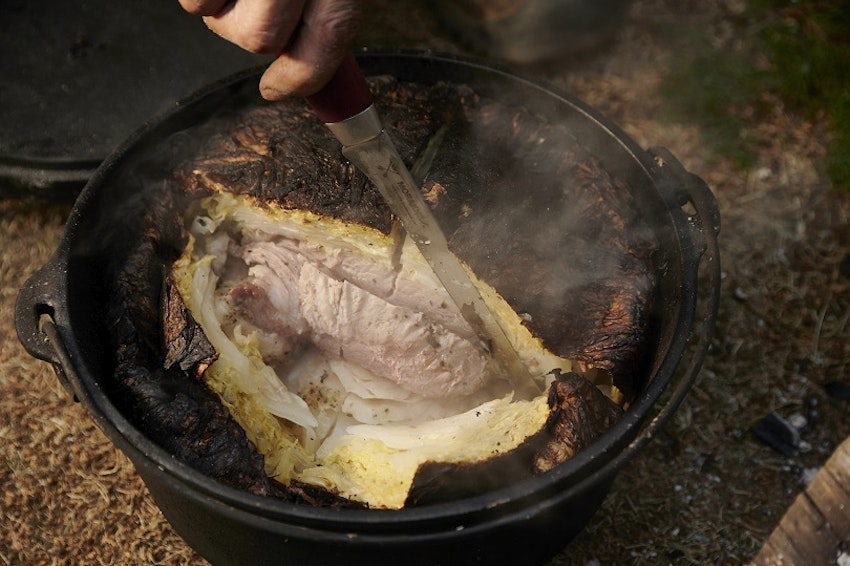 4.ダッチオーブンに③を敷き詰め、2の豚肉を入れて1時間程炭火の中に置いて完成。