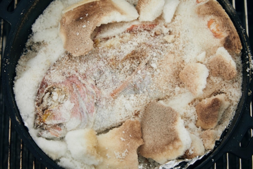 4.上火強めで約60分加熱し、塩の表面が固まったら出来上がり。