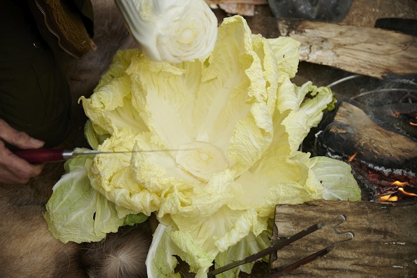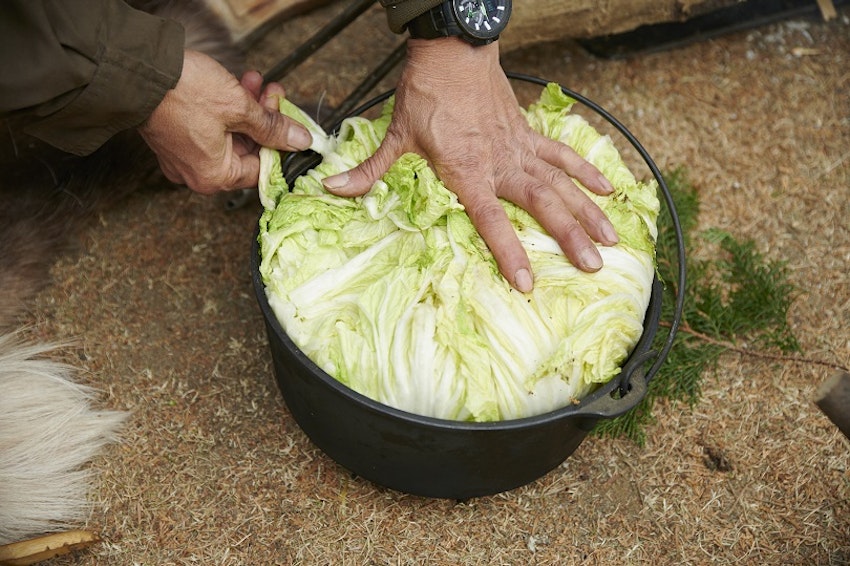 8.フタを外し、白菜の上部をめくり肉の中心へ串を刺して透き通った汁が出てるようであれば完成。