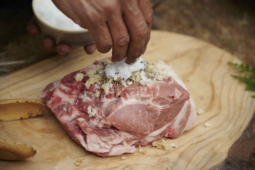 2.豚肩ロースのブロック肉へたっぷりの塩こしょうとおろしにんにくを擦り込む。