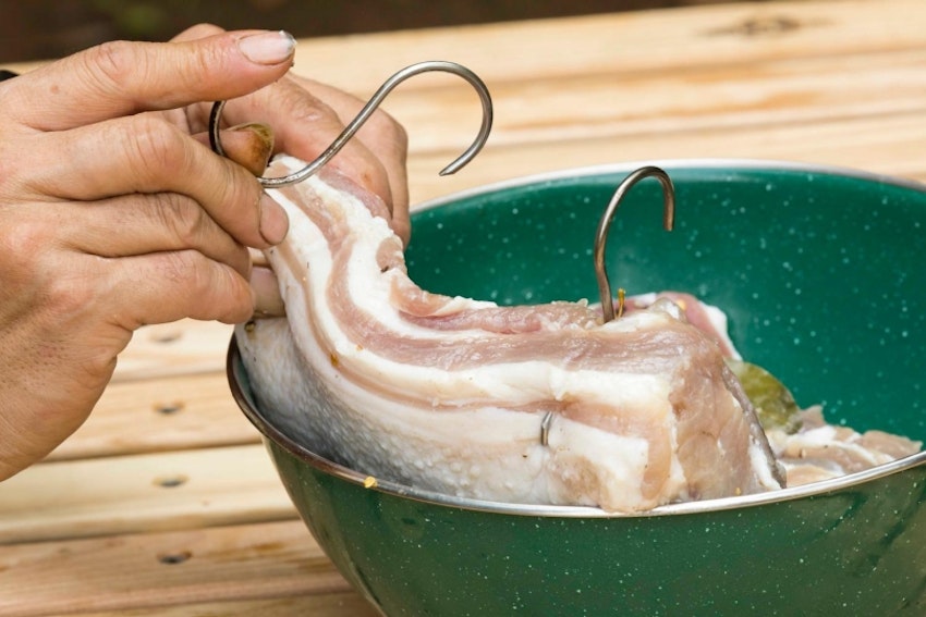 2.豚バラ肉の上側に2本、下側に2本、S字フックを刺し込む。