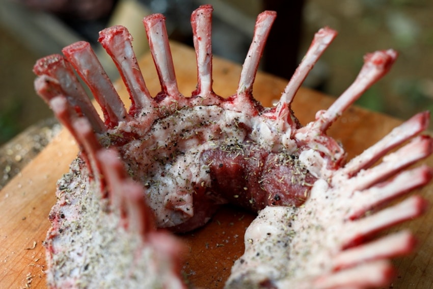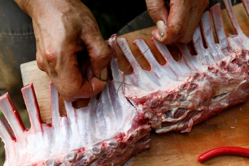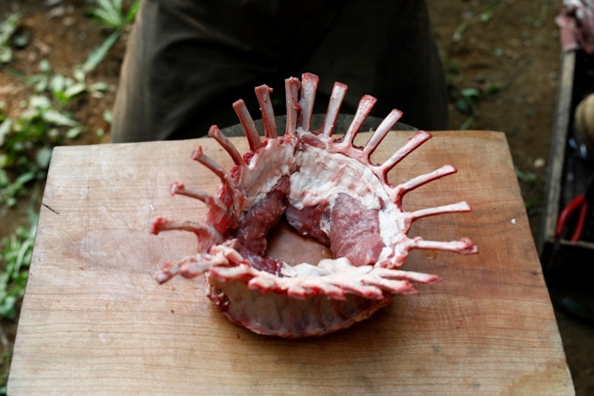6.ラムラックを一度外し、上下をひっくり返してフックを掛け直す。もう一度チェーンに吊るし、さらに30分焚き火で炙る。
