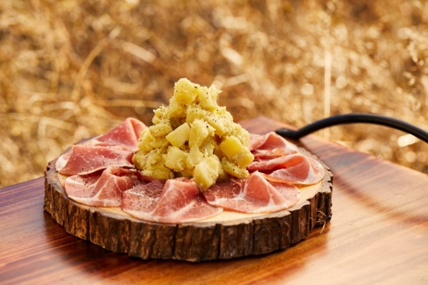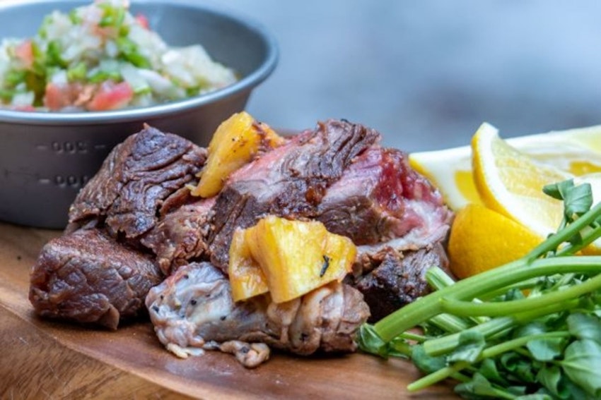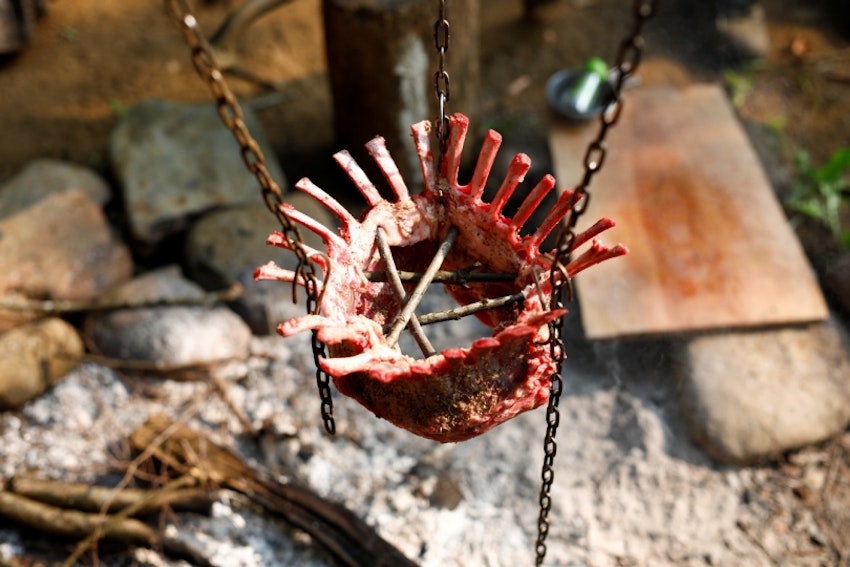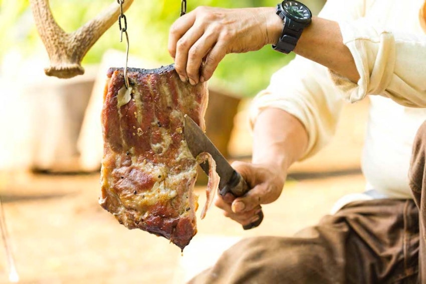 吊るされたままの状態でナイフで削いで食べるとさらにワイルド!5時間待たずとも、焼けたところちびちび食べ始めてもOK。