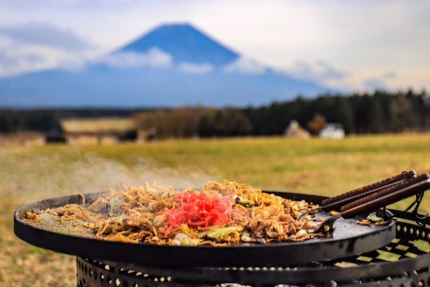 静岡県富士宮市のご当地グルメ「富士宮やきそば」を、富士山を臨みながらいただいている様子!美味しさも倍増ですね。少し焦げたソースの香ばしい香りがこちらまでしてくるようです。焚き火台とセットで販売されている鉄板などもあるので、@ryo_103さんのようなアイテムを使うのもオススメです!