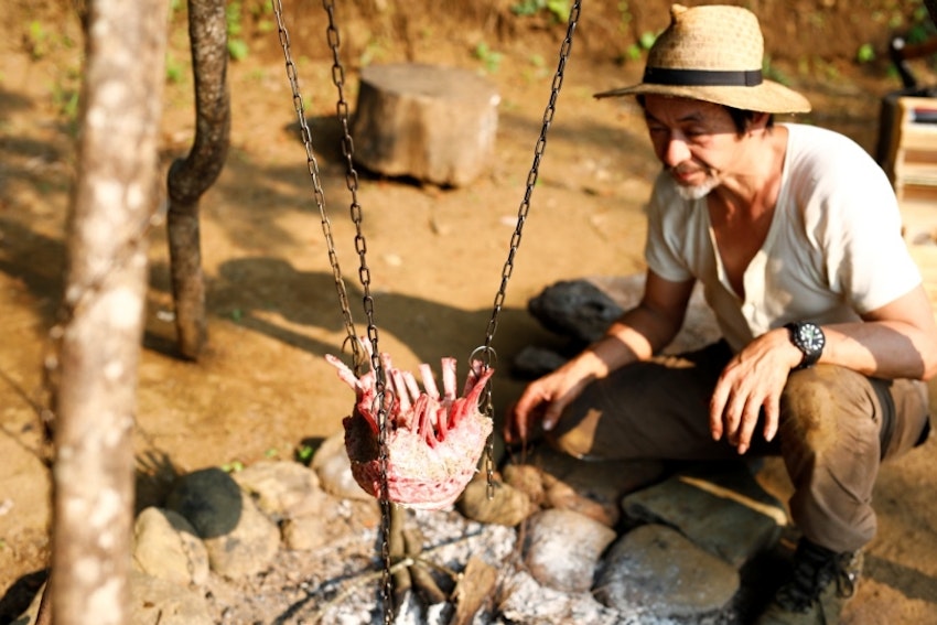 2.焚火台に網をのせ、その上に牛モモ肉をのせて直火で焼く。裏面や側面もじっくり時間をかけて焼く。