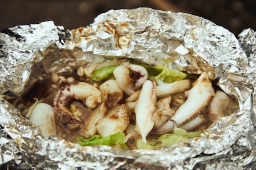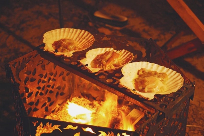 焚き火に網をのせて直火で焼いていく一品です。大きくて立派なこちらのホタテは身がぷりぷりでとってもおいしそう!ホタテの殻をフライパン兼お皿のように使えば、ホタテの旨みをすべて逃がさずいただくことができますね!