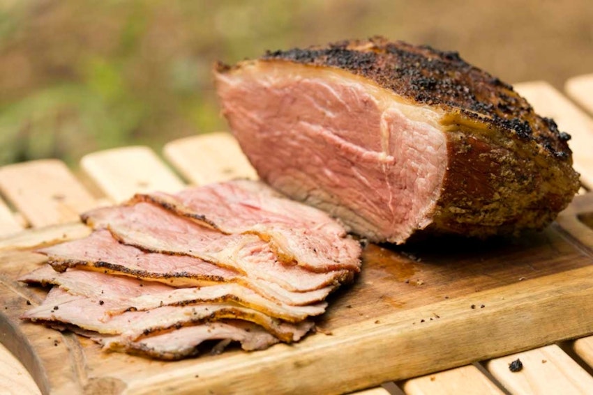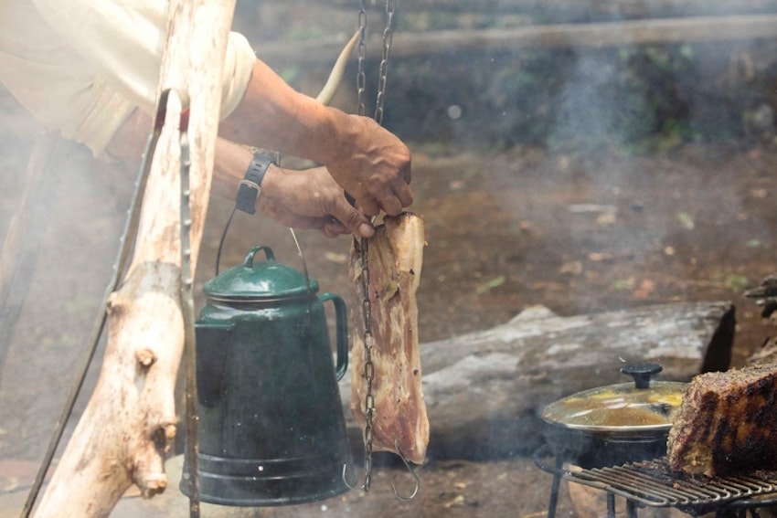 3.トライポッドに豚肉を吊るす。約1〜2時間燻したら豚肉を上下逆さにし、約5時間さらにいぶしたら出来上がり。