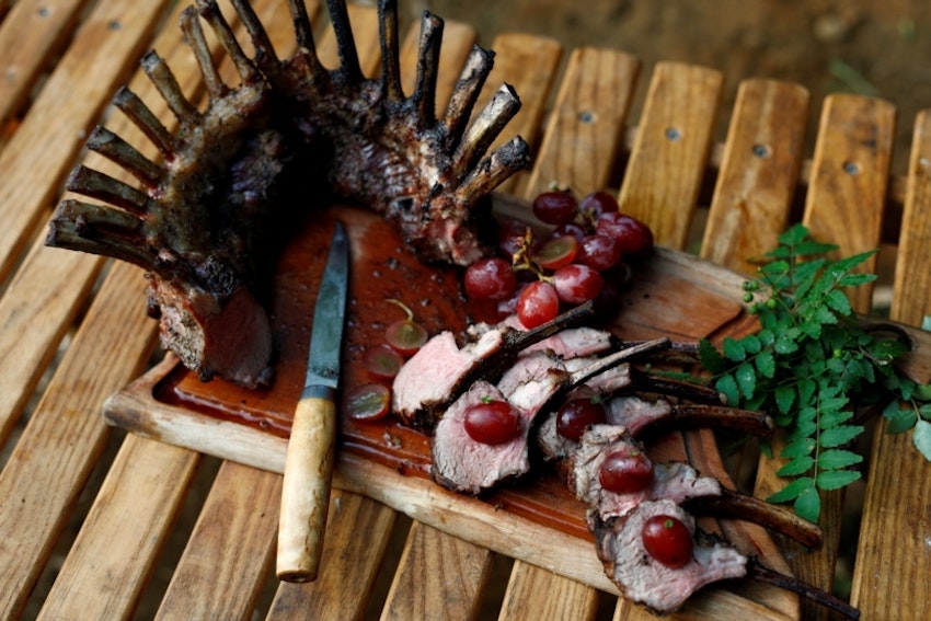8.ワイヤーを外し、骨の間からスライスする。最後にお好みで半分にカットしたブドウと山椒の実をのせて完成。