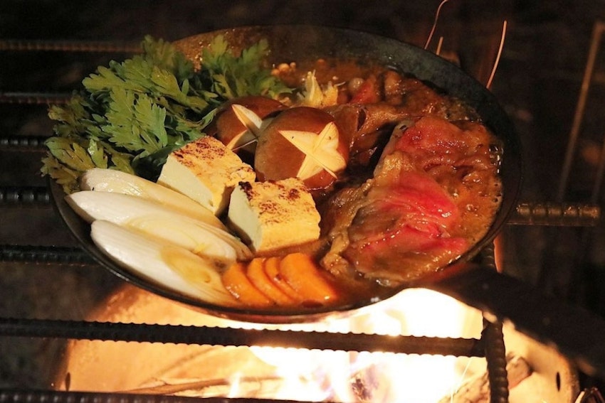 すき焼きだって焚き火の上に置けばワイルドなキャンプ料理になってしまうから不思議です!馴染みの味も外で食べればいつもと一味違って感じるはず。焚き火を囲み、身も心も温まりましょう