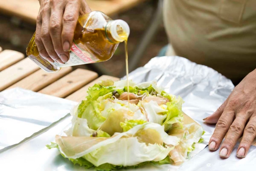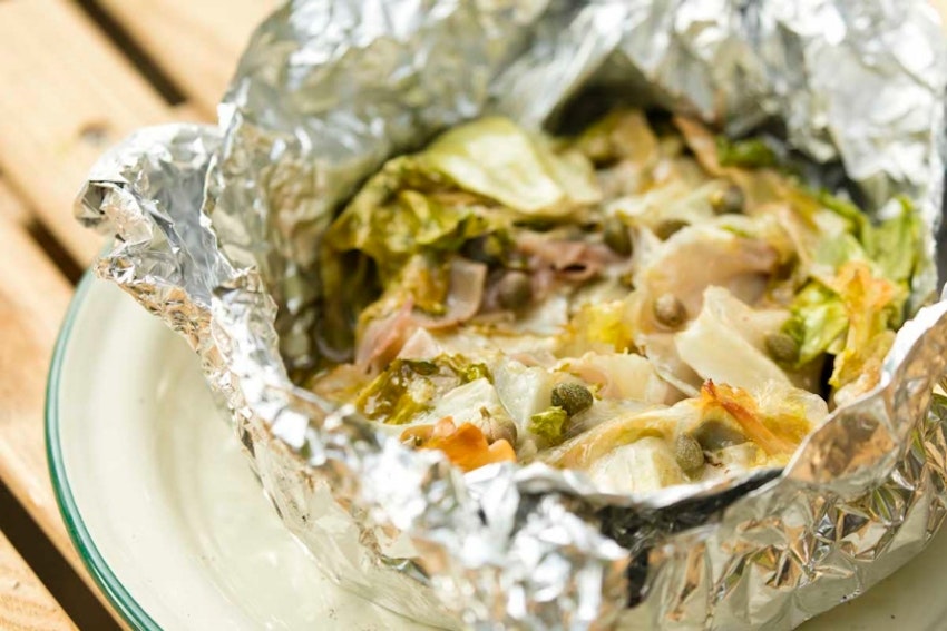 キャンプの定番料理アヒージョは、焚き火にもうってつけ。強い火力でグツグツと油が沸き立ち、にんにくの香ばしい香りが食欲をそそります。旨みが出たオイルもパンを浸していただきたいですね。火傷に十分に注意してアツアツを召し上がれ!