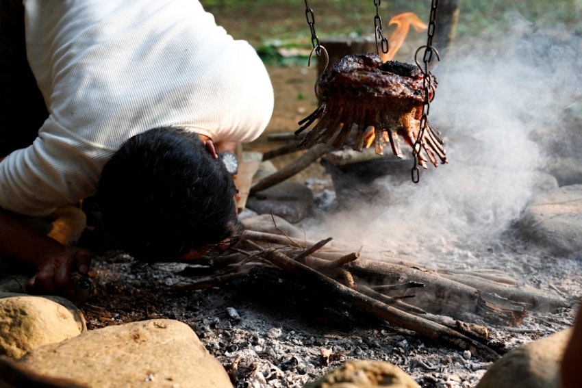 5.つなげたラムラックの内側に、木の枝を数本つっかえ棒になるように入れて広げる。そしてトライポッドの下に焚き火を起こし1時間半ローストする。