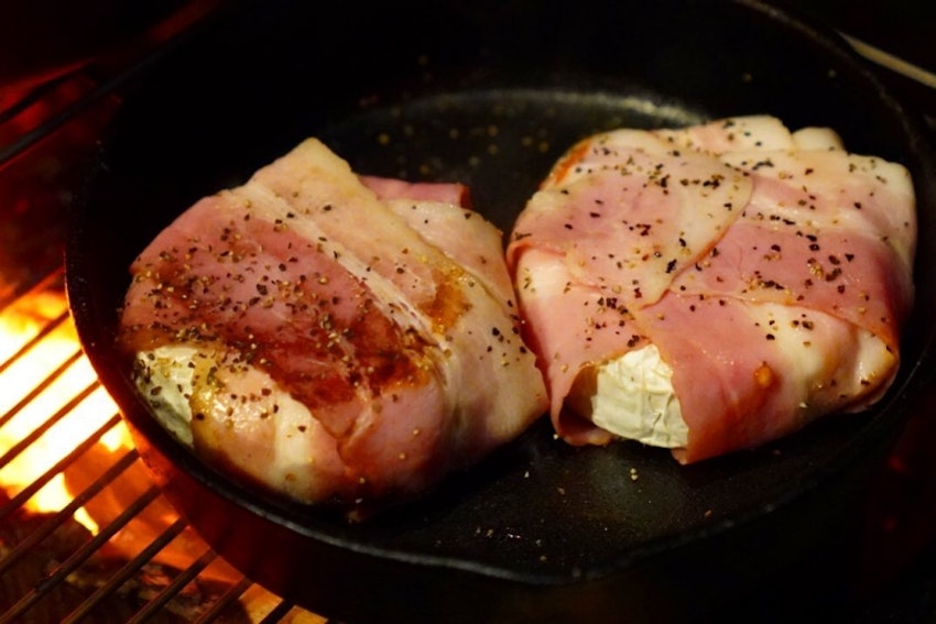 カマンベールチーズをまるごとベーコンで巻いて焚き火で焼けば、チーズはとろとろ、ベーコンはこんがり!ブラックペッパーがぴりっときいて、おつまみに最適です!お酒が進んでしまいそうですね!