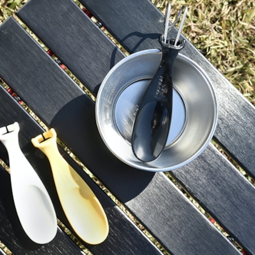 シェラカップの取っ手に付けられる小さなスプーン。ソロキャンなど大袈裟なカトラリーが必要ないキャンプで、スプーンだけ持っていくときに失くしにくくなります。
