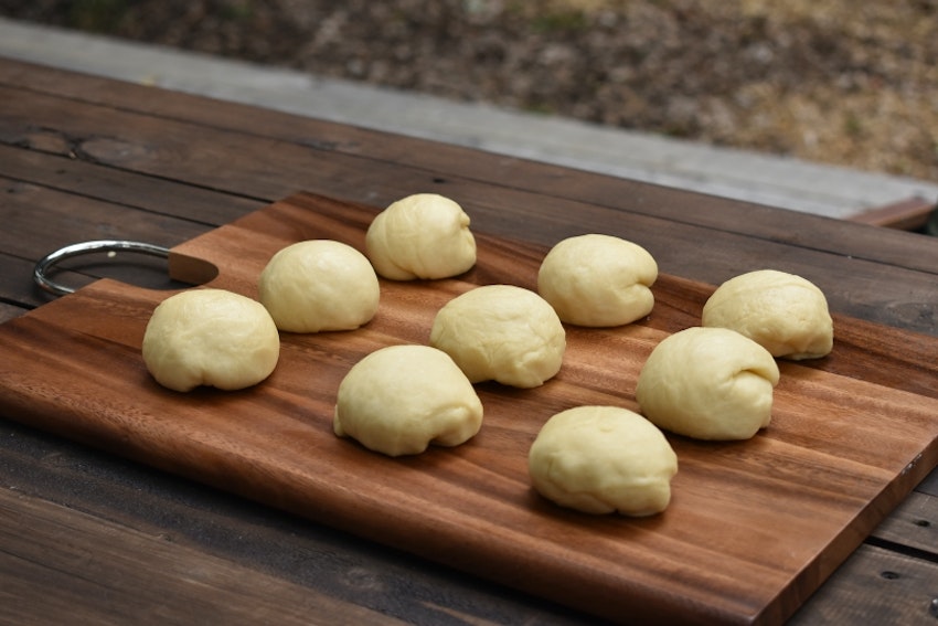 生地を9等分(1個60g前後)にして丸める。バットなどに並べてラップをかぶせ、15分程度おく。(ベンチタイム)