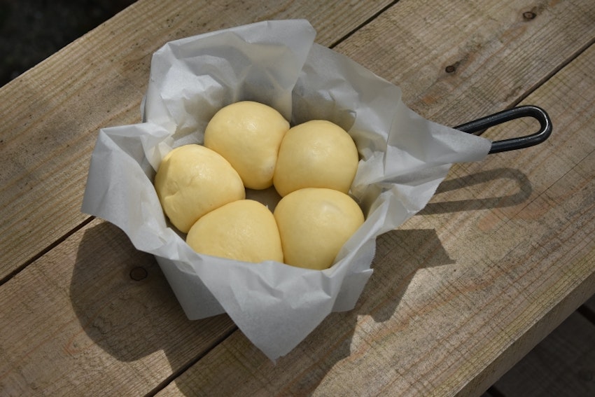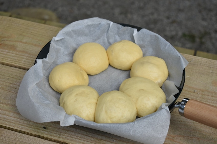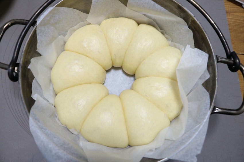 1.クッキングシートを敷いたダッチオーブンに生地をふちにそうように並べ、ラップをして2倍に膨らむまで40~50分生地を二次発酵させる。