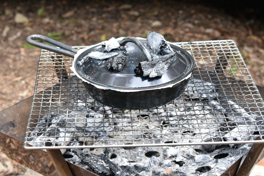 2.焚き火台の炭(熾火)の上(焚き火スタンドなどで遠火にするのがおすすめ)にスキレットをのせ、フタの上にも炭(熾火)を置く。