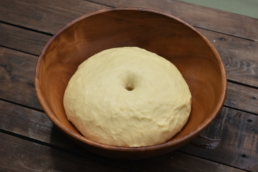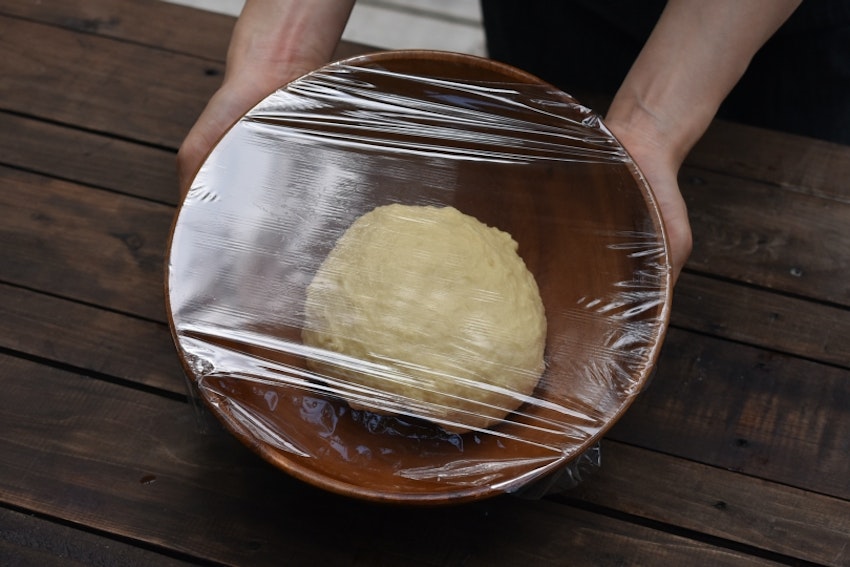 1.ボウルなどに生地を置き、ラップをして2倍に膨らむまで40~50分生地を二次発酵させる。