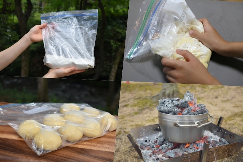 パン生地を作る際に、材料をジップロックなどの密閉袋に入れてこねると手が汚れません。野外で手で混ぜるより衛生的にもいいでしょう。