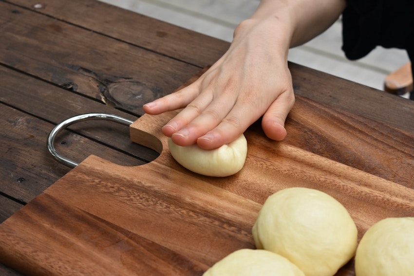 ベンチタイム後、生地をひとつずつ手で軽く潰しながらこねてガスを抜き、再び丸く成形する。