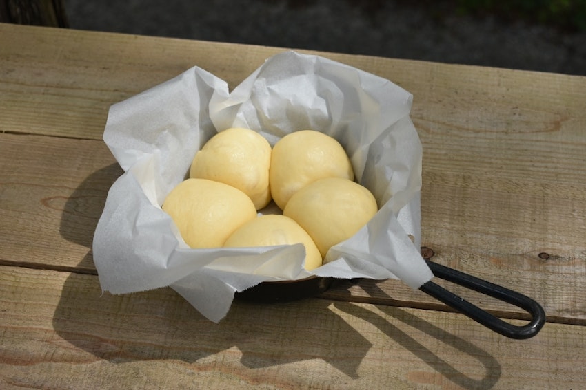 1.クッキングシートを敷いたスキレットに生地をふちにそうように並べ、ラップをして2倍に膨らむまで40~50分生地を二次発酵させる。