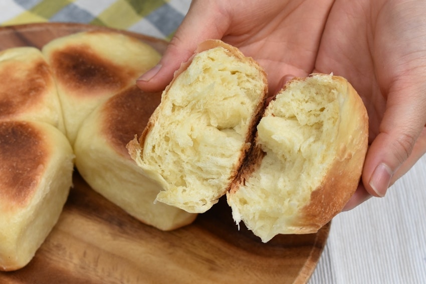 四角い形状をうまく使って、上下左右から火を通すことでパンを焼けます。小さな食パンのようなフォルムになり可愛く仕上がります。