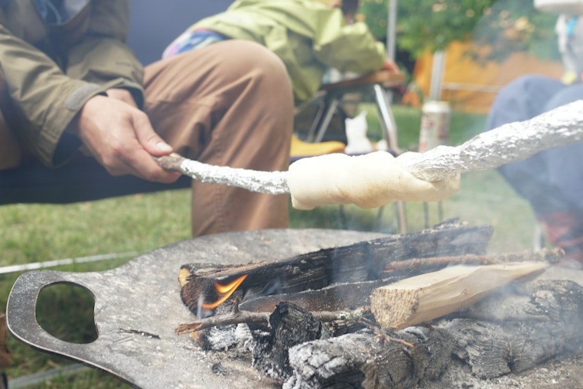 木の棒にアルミホイルを巻き、その上からパン生地を巻き付けて焚き火であぶることで、パンを焼けます。家族や仲間と一緒に楽しめるのもポイント。
