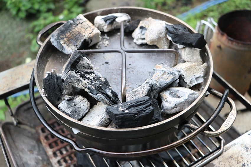 焼くときのポイントは下火は鍋底に火を当てないように遠火、フタの上は炭を置きすぎないようにすること。フタの上に炭を山盛りにしてしまうと表面だけ焦げ、中が生焼けになるので注意してください。