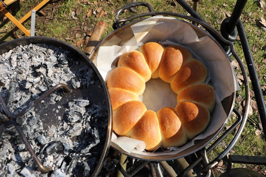 キャンプでオーブン調理をする際の王道な調理器具。フタの上に炭を置くことで、オーブンのような使い方ができるため、パンがおいしく焼けます。