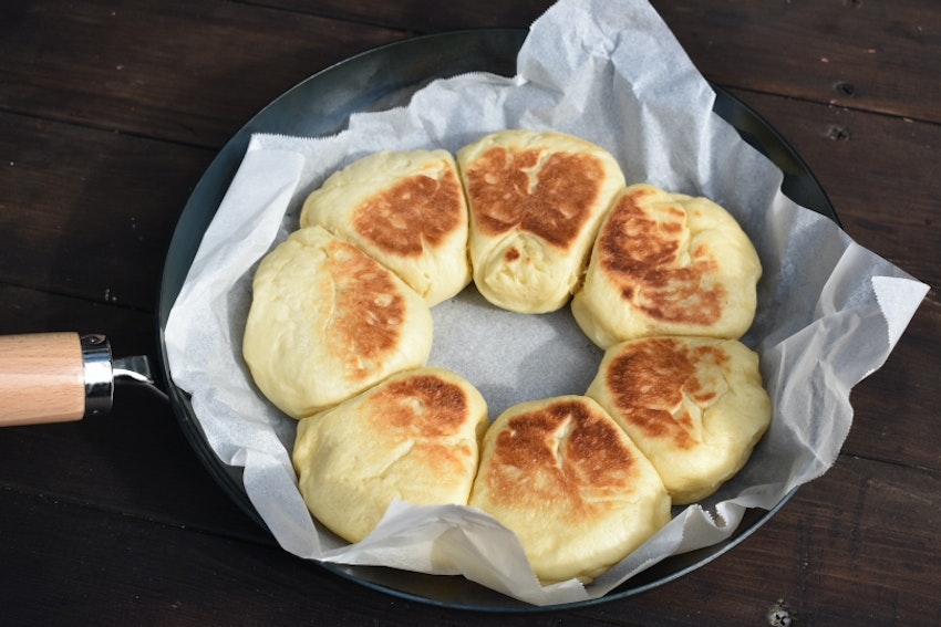一般的なフライパンでもパンをひっくり返しながら火を入れれば、焼き上げられます。フタがないスキレットの場合も、フライパンと同じような焼き方が可能です。