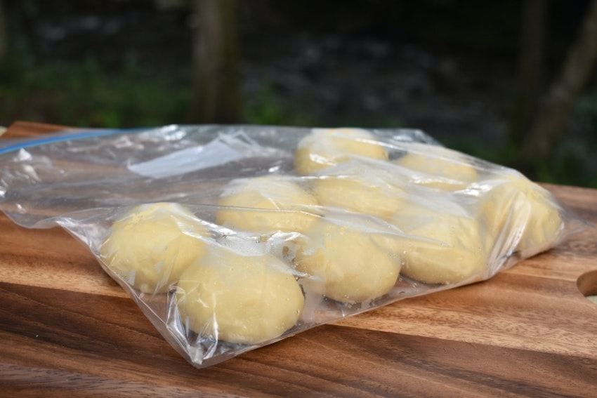 パン生地を自宅で途中まで作ると、現場での作業がぐっと楽になります。一次発酵を終えて生地を小分けにしてから冷凍して持っていき、キャンプ場で二次発酵からスタートさせます。
